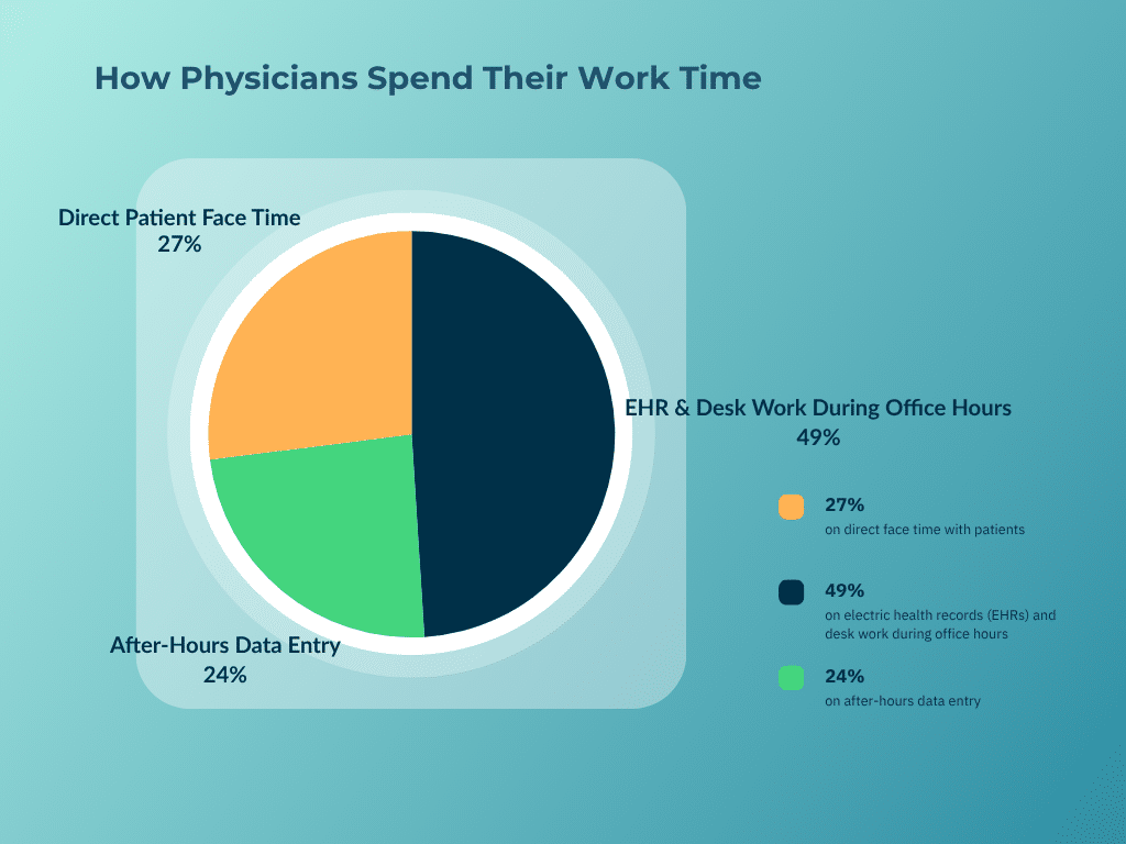 According to a study published in Annals of Internal Medicine, doctors spend over 49% of their workday on documentation and desk work, with only 27% of their time actually spent with patients. That’s nearly twice as much time spent on paperwork as on patient care — and that imbalance is hurting everyone.